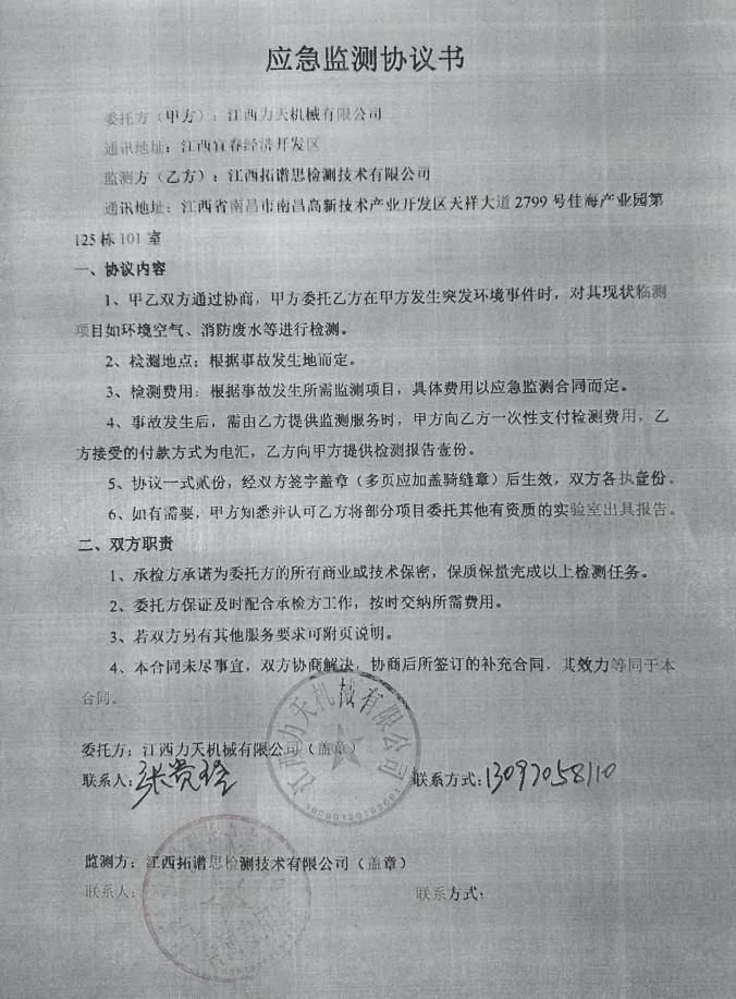 (2)江西力天機(jī)械有限公司外部救援機(jī)構(gòu)為政府職能部門及周邊企業(yè),一旦發(fā)生突發(fā)環(huán)境事件,通過信息傳遞需要實(shí)施外部救援時(shí),相關(guān)部門及單位本著“以人為本,快速響應(yīng)”的原則,能迅速對(duì)本企業(yè)進(jìn)行應(yīng)急救援。
