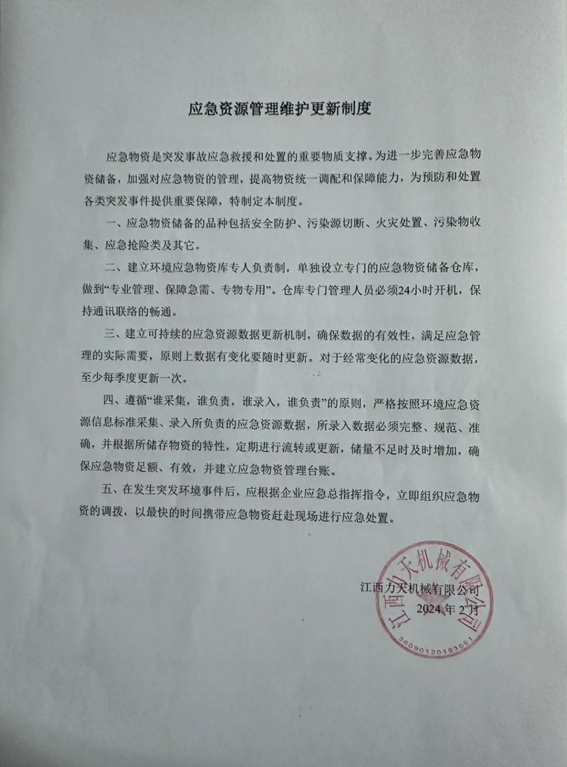 江西力天機(jī)械有限公司成立了應(yīng)急預(yù)案編制小組,根據(jù)應(yīng)急資源調(diào)查實(shí)際情況編制形成應(yīng)急資源調(diào)查報(bào)告。
